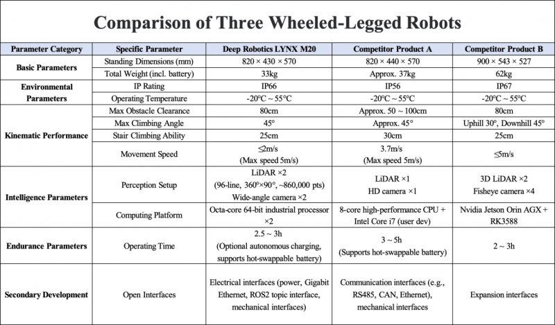 In terms of locomotion capability, the three products have comparable paper specifications. Product A excels at stair climbing. Product B leads in standard speed but is mostly limited to indoor structured scenarios. LYNX M20, however, shows no weaknesses with its "all-terrain adaptability," demonstrating robust mobility in unstructured terrains such as the soft sandy beaches of Saudi Arabia and the arched bridges of Xixi Wetland.
