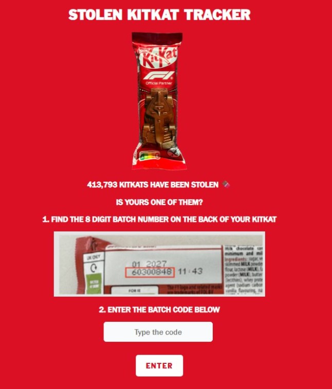 Nestlé has set up an online stolen KitKat tracker for shoppers to check their bars (Picture: stolen KitKat Tracker)It said in a statement following the theft: ‘We’ve always encouraged people to have a break with KITKAT – but it seems thieves have taken the message too literally and made a break with more than 12 tonnes of our chocolate.‘Whilst we appreciate the criminals’ exceptional taste,the fact remains that cargo theft is an escalating issue for businesses of all sizes.‘With more sophisticated schemes being deployed on a regular basis,we have chosen to go public with our own experience in the hope that it raises awareness of an increasingly common criminal trend.’Get in touch with our news team by emailing us at .
