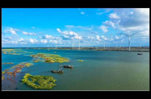 Off the coast of Dongying in the Bohai Sea, rows of giant offshore wind turbines rise above the waves.