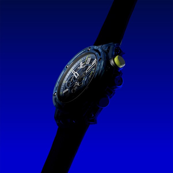 The composite that makes up the case and bezel of the watch is made of Epoxy resin reinforced with quartz powder and glass veil that has been fused with the recycled racquets and shirts. The resulting material is speckled with fragments of light & dark blue textiles and black carbon to create a singular camo aesthetic. An innovative approach,representative of Hublot's ambition for endless reinvention.