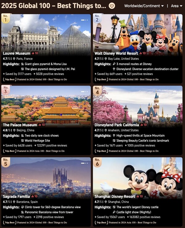 New regional rankings:Trip.Best 2025 introduces Europe 100 and Americas 100 rankings for the first time,alongside existing Global 100 and Asia 100 rankings.