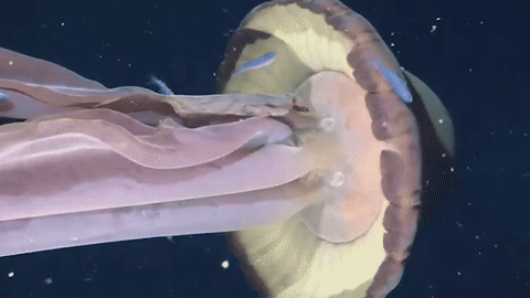 Eerie yet fascinating footage shows the 10-metre-long sea creature gently pulsing and swirling its way through the dark waters.